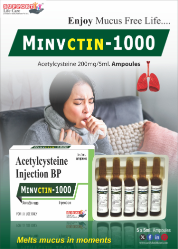 Acetylcysteine Injection is used in the treatment of liver damage caused by an overdose of acetaminophen. It works well for reducing toxicity when taken within eight to 10 hours of an overdose. It can be taken for at least 5 days and can be further stretched to 2 weeks depending upon the condition of the patient. Acetylcysteine Injection is sold under the brand name MINVCTIN-1000. Any type of Cough syrups should be avoided for some time while taking Acetylcysteine Injection because it may affect the treatment of the drugs.