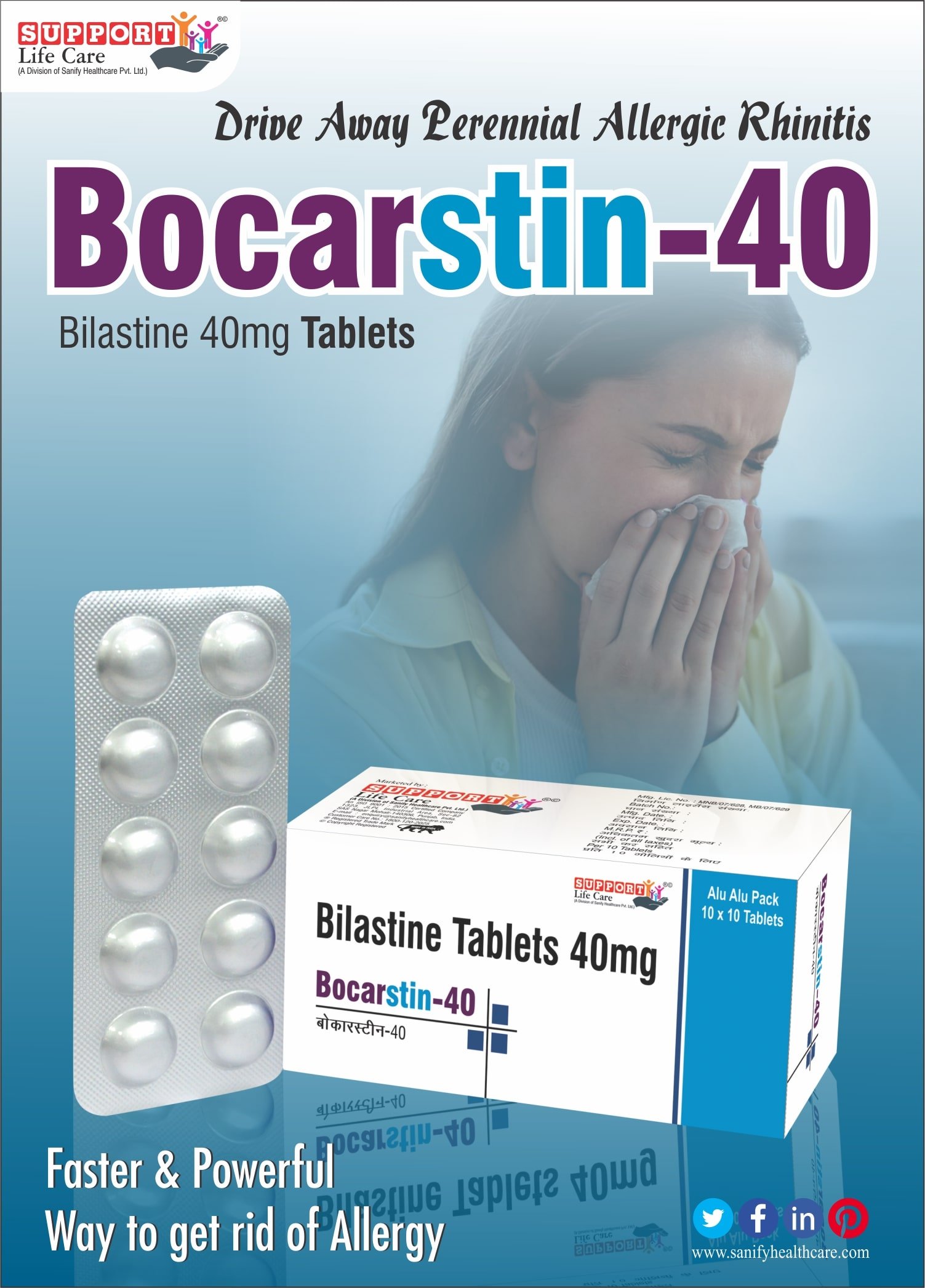 BOCARSTIN-40 is an antihistamine tablet that is specially used to provide rapid relief from symptoms like allergic conditions, such as rhinitis, and chronic urticaria. It is known for its long-lasting effect, and it is suitable for individuals who require symptom control. It is taken once daily and used to provide rapid relief and is easy to use.
