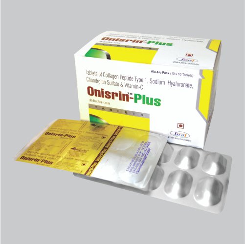 COLLAGEN PEPTIDE TYPE I+SODIUM HYALURONATE+CHONDROITIN SULFATE+VITAMIN C is a combination medicine that belongs to the class of drugs called nutritional supplements. The tablets are indicated for the maintenance of joints, muscles, cartilage, the integrity .of joints, bone health, joint pain, arthritic pain, stiffness, low back pain, tendonitis, or tendinopathy (tendon pain). Collagen peptide type 1 helps in the regeneration of cartilage and provides strength to the bones and improves the flexibility of muscles. Sodium Hyaluronate is a lubricant for the joints that reduce friction in the joints. Vitamin C is an antioxidant that promotes collagen fiber formation, increases iron absorption, and stimulates blood vessel formation. Chondroitin sulfate staves off the breakdown of collagen tissue in the joints.