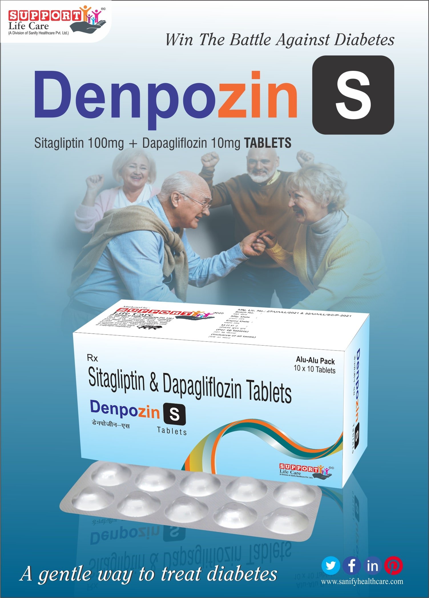 DENPOZIN-S Tablets is an antidiabetic medication manufactured by Sanify Healthcare. It is used to treat and manage Type 2 diabetes in Adults. The two active agents provide a dual mechanism of action with complementary activity in glycemic control throughout the day. DENPOZIN-S Tablets is classified as an SGLT-2 inhibitor and promote urinary glucose excretion as the main mechanism. Sitagliptin is a DPP-4 inhibitor and works through two actions that enhance the body’s natural incretin response and lead to increased secretion of insulin and decreased secretion of glucagon, especially after meals.