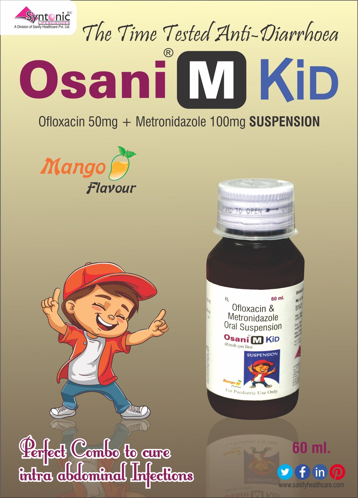 Ofloxacin and Metronidazole Benzoate syrup are available under the brand name OSANI-M KID. It is manufactured and supplied by one of the top PCD Pharma franchise companies known as Sanify Healthcare Pvt. Ltd. Ofloxacin and Metronidazole Benzoate syrup is an antibiotic medicine that is commonly used to treat bacterial infections of the skin, throat, ears, and lungs in children.