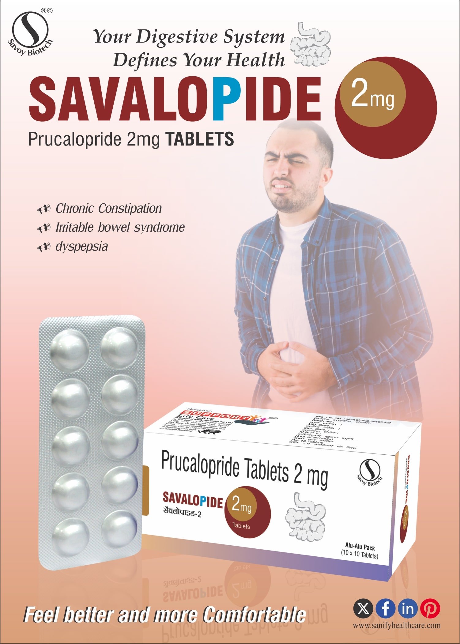 Prucalopride Succinate tablets are offered under the brand name SAVALOPIDE-2. It is a medication used to treat chronic idiopathic constipation (CIC) in adults when laxatives fail to provide adequate relief. It works as a selective serotonin 5-HT₄ receptor agonist, stimulating colonic motility and enhancing bowel movements. Clinical studies have shown its efficacy in improving bowel function and quality of life in chronic constipation.