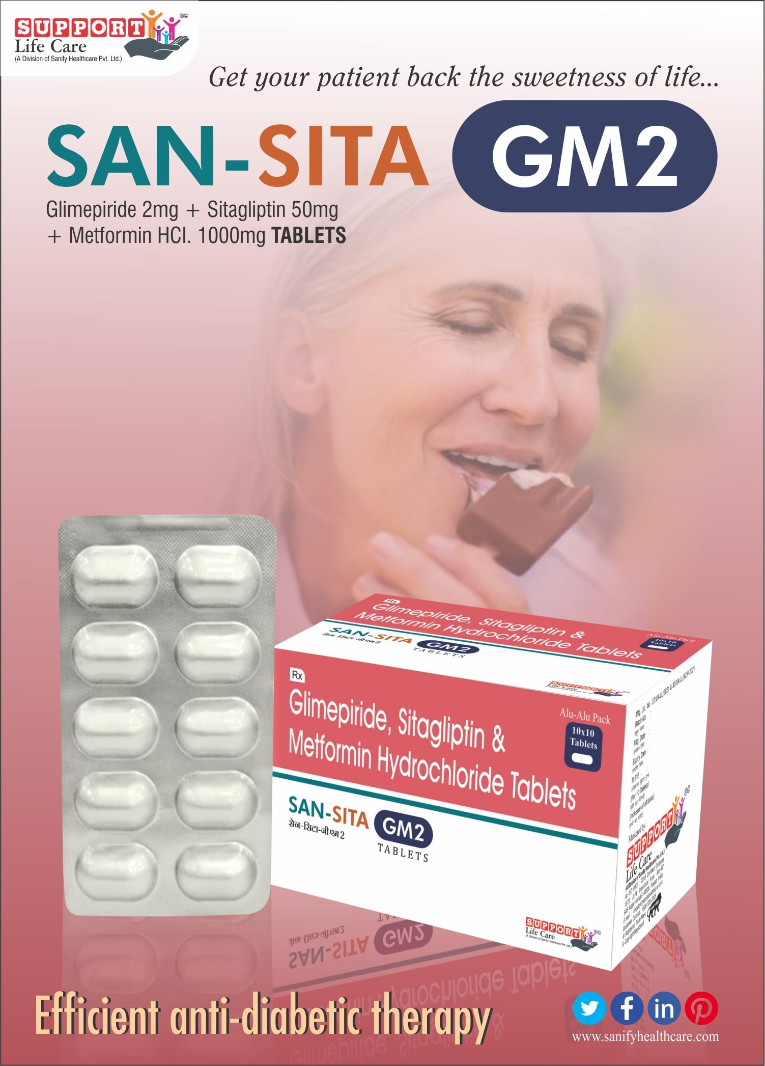 “Each film coated tablet contains: Sitagliptin Phosphate Monohydrate IP 50mg+Metformin Hydrochloride IP 1000mg+Glimepiride IP 2mg”